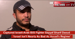 Sayyaf Sharif Daoud, a captured Islamic State fighter who holds Israeli citizenship, told BBC correspondent Feras Kilani on BBC Arabic (UK) earlier this month that he had joined ISIS instead of the Palestinian resistance because his experience of having lived through the Second Intifada (Palestinian uprising), and living in Israel had taught him that Israel “has not done 1% of what [Syrian President] Bashar al-Assad has done.”