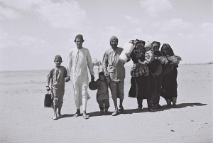 Yemenite Jewish refugee family walks through the desert to a way- camp on their journey to Israel.